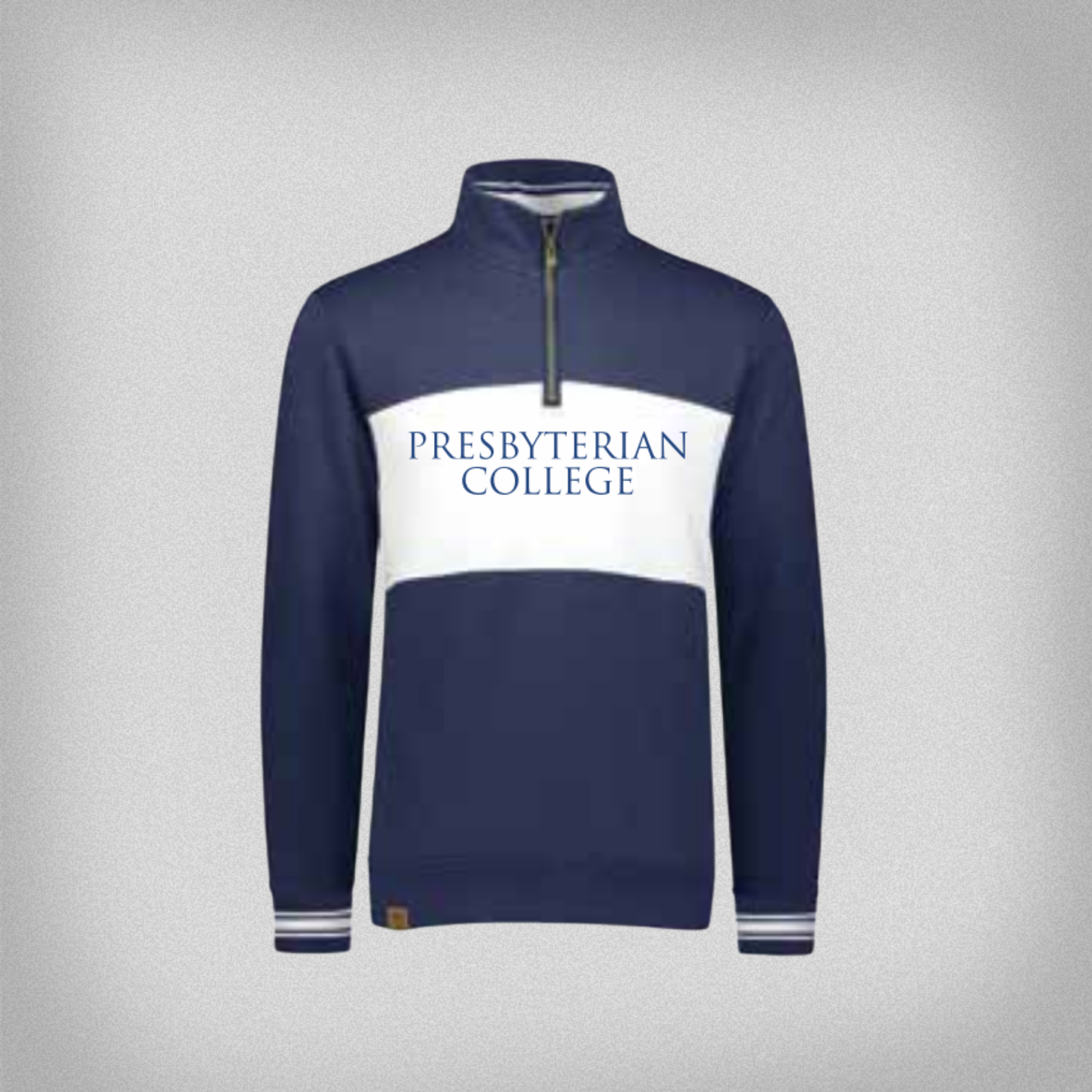 Stay comfortable and show your school pride with the All American 1/4 Zip Sweatshirt. This sporty navy quarter-zip features a bold white color block stripe and a blue Presbyterian College screenprint across the chest. Striped navy and white elastic wristbands add a dynamic, athletic touch while ensuring a snug fit. Perfect for supporting your team in style and comfort.